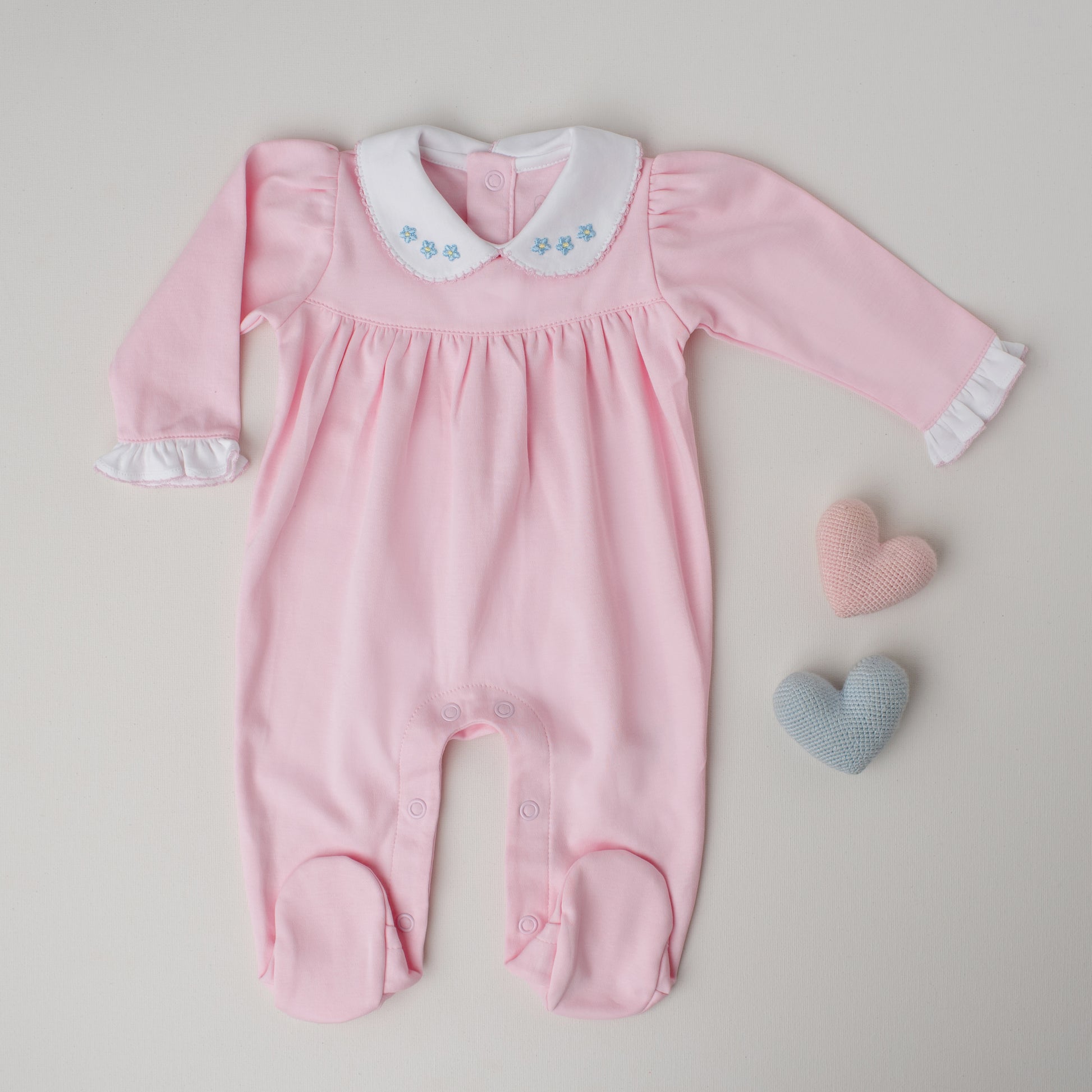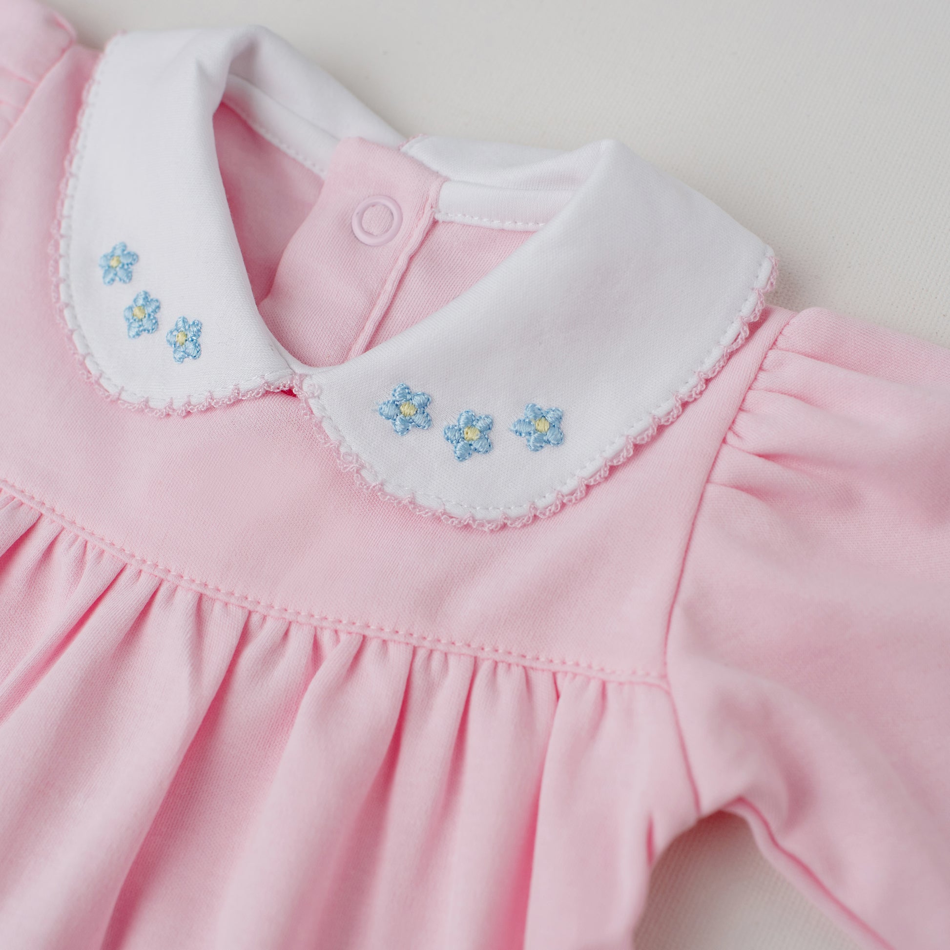 Em um delicado tom de rosa claro, esse macacão possui mangas bufantes franzidas no punho e gola redonda com bordado de flores azuis. É franzido no peito e abre nas costas com botões de pressão. Charmoso, delicado e delicioso para uma noite de sono restauradora.