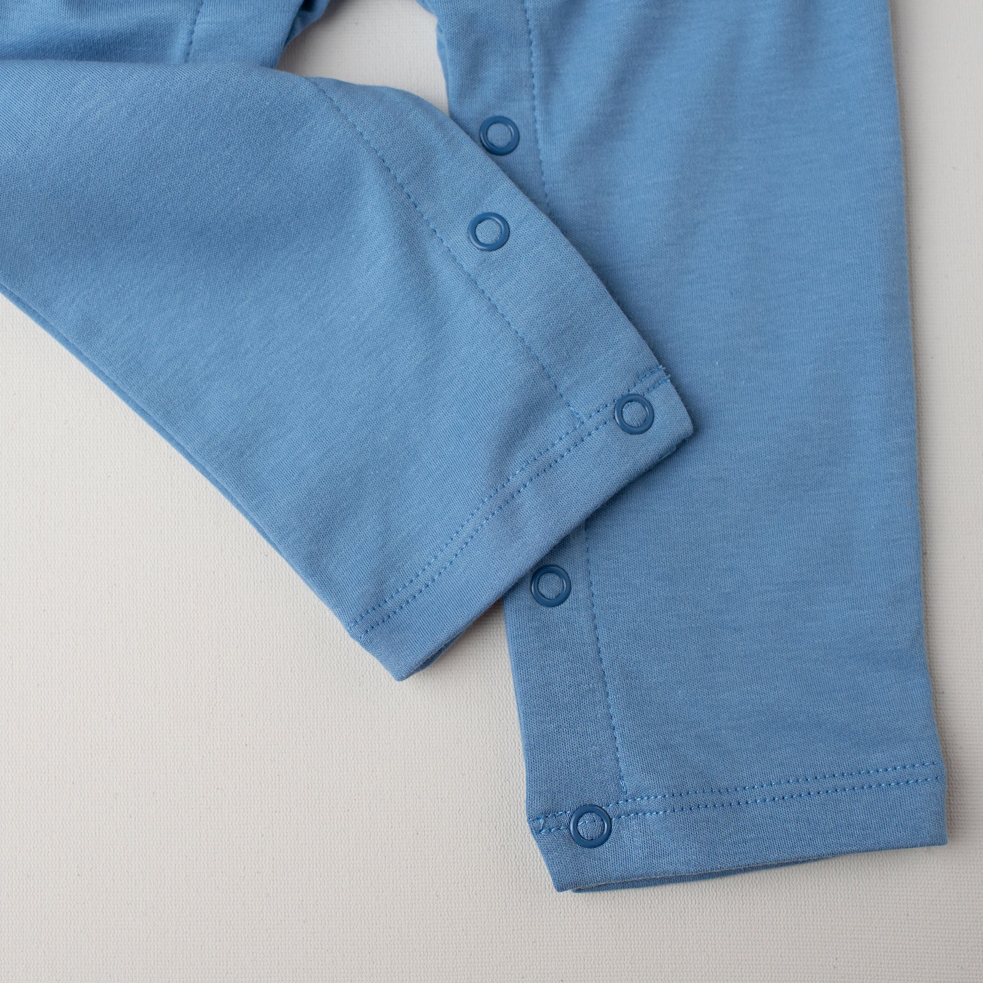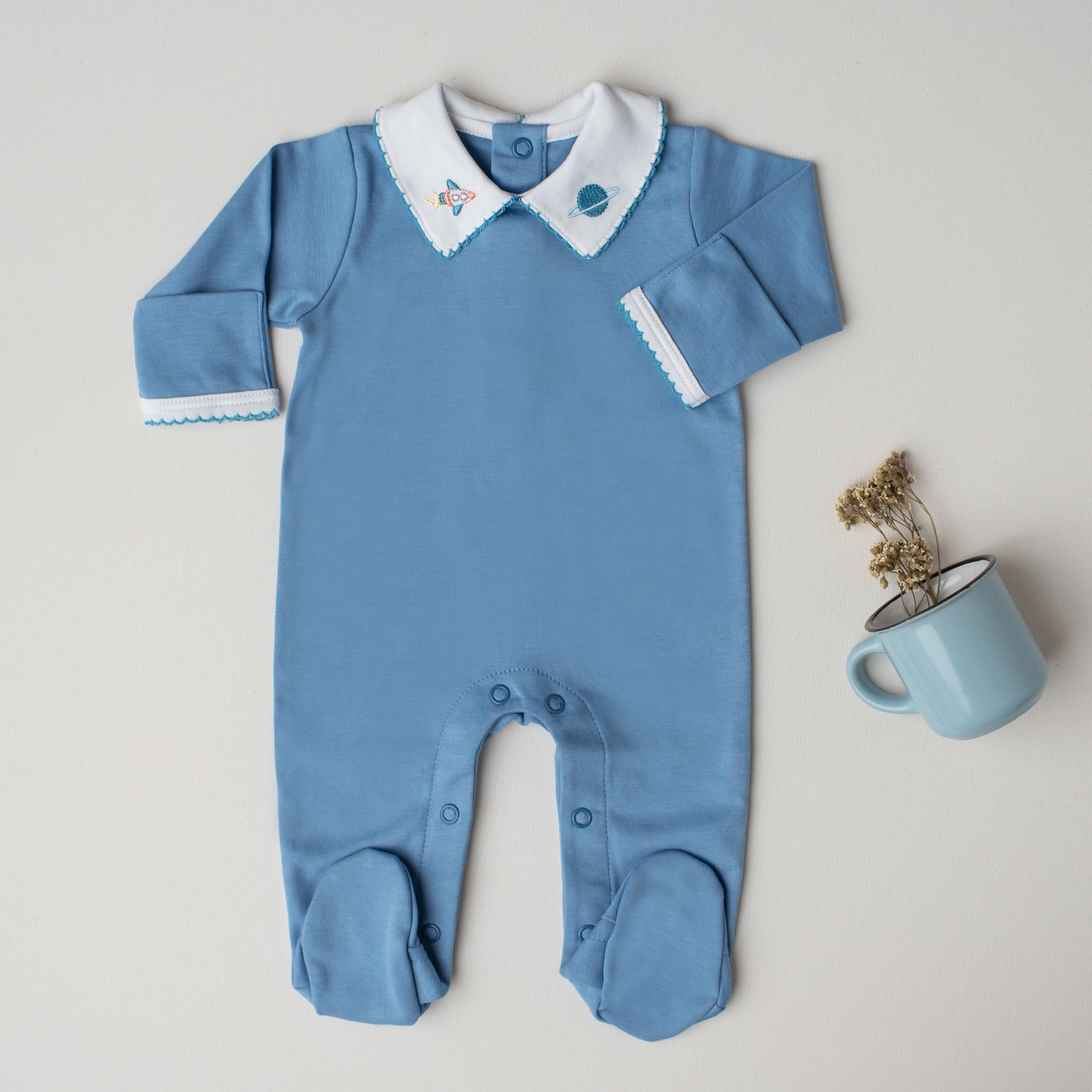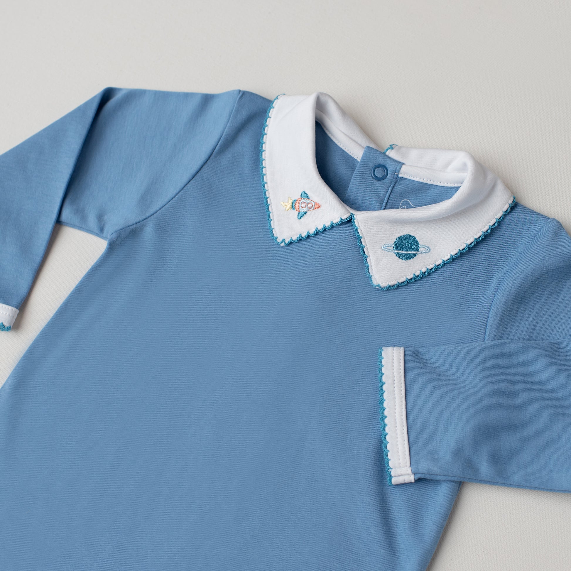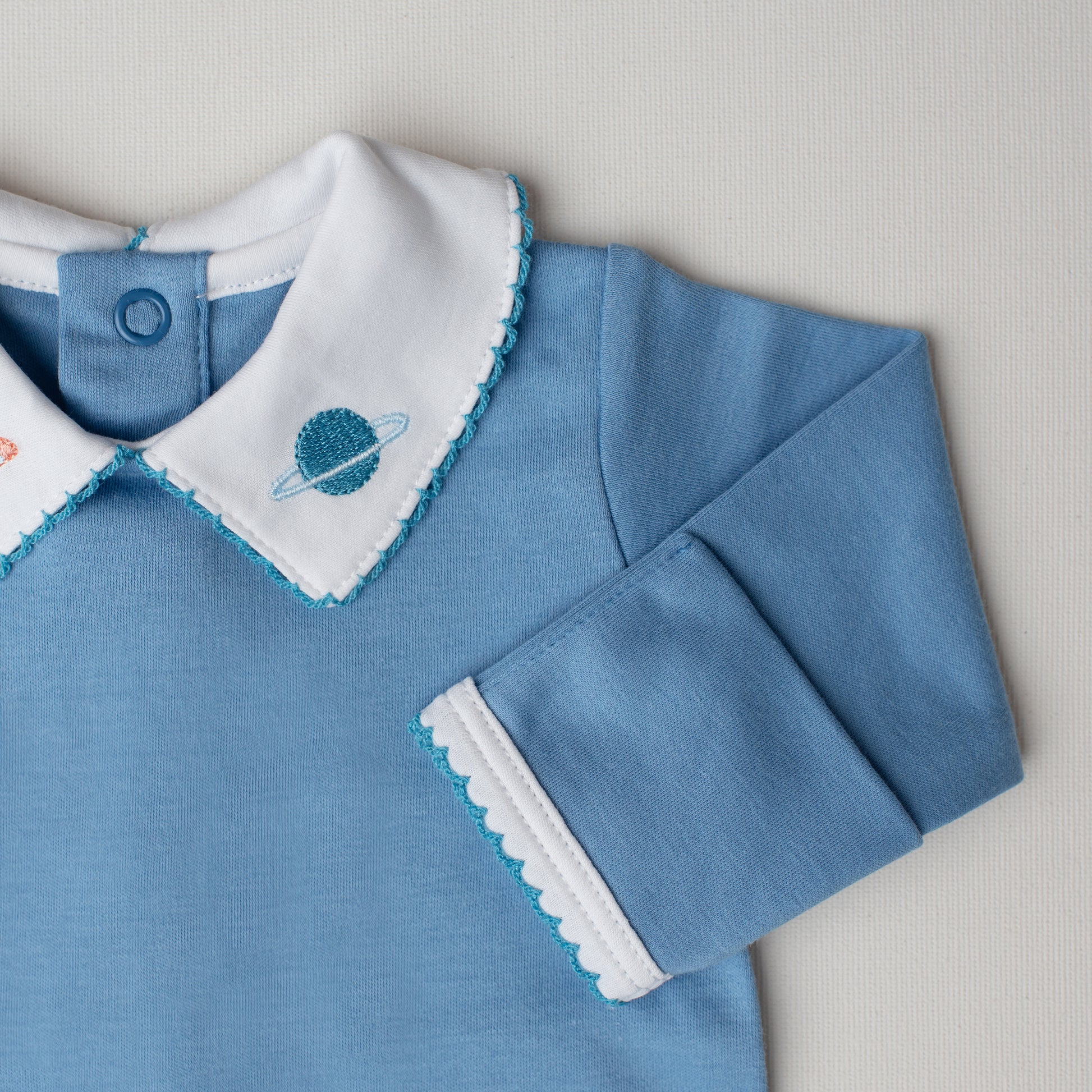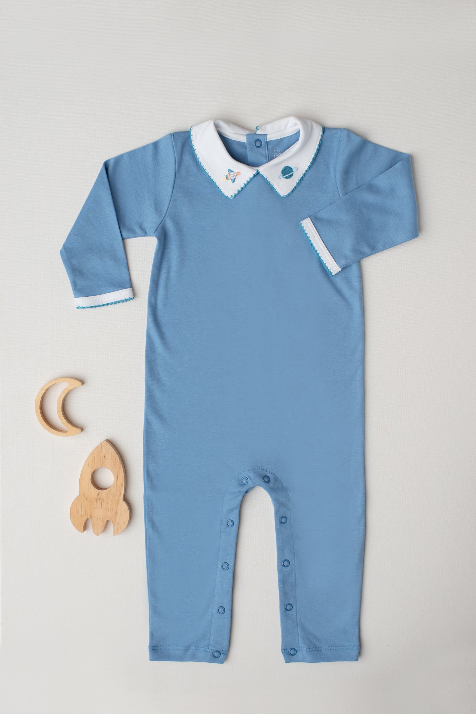 Um macacão tão elegante que vai do pijama ao passeio! Nosso macacão quero-quero é delicioso e arrumadinho: em um lindo tom de azul, tem a gola em ponta com o bordado de foguete e planeta.