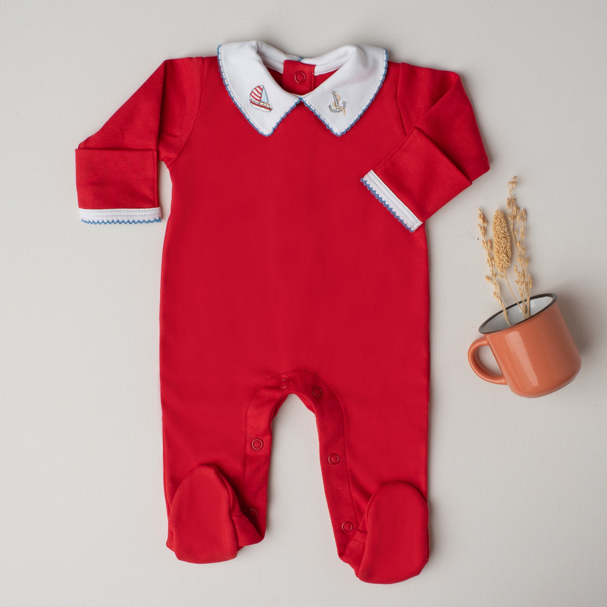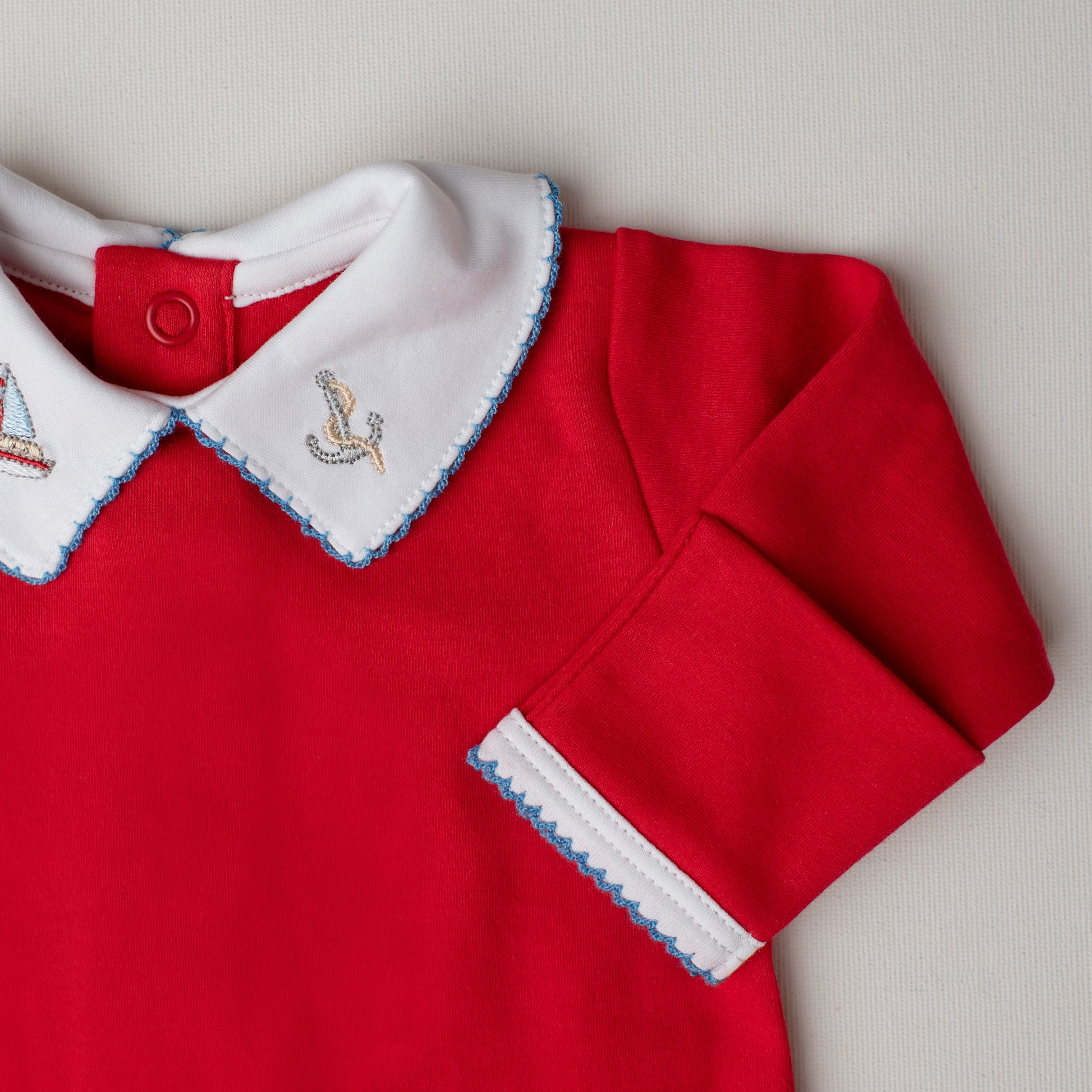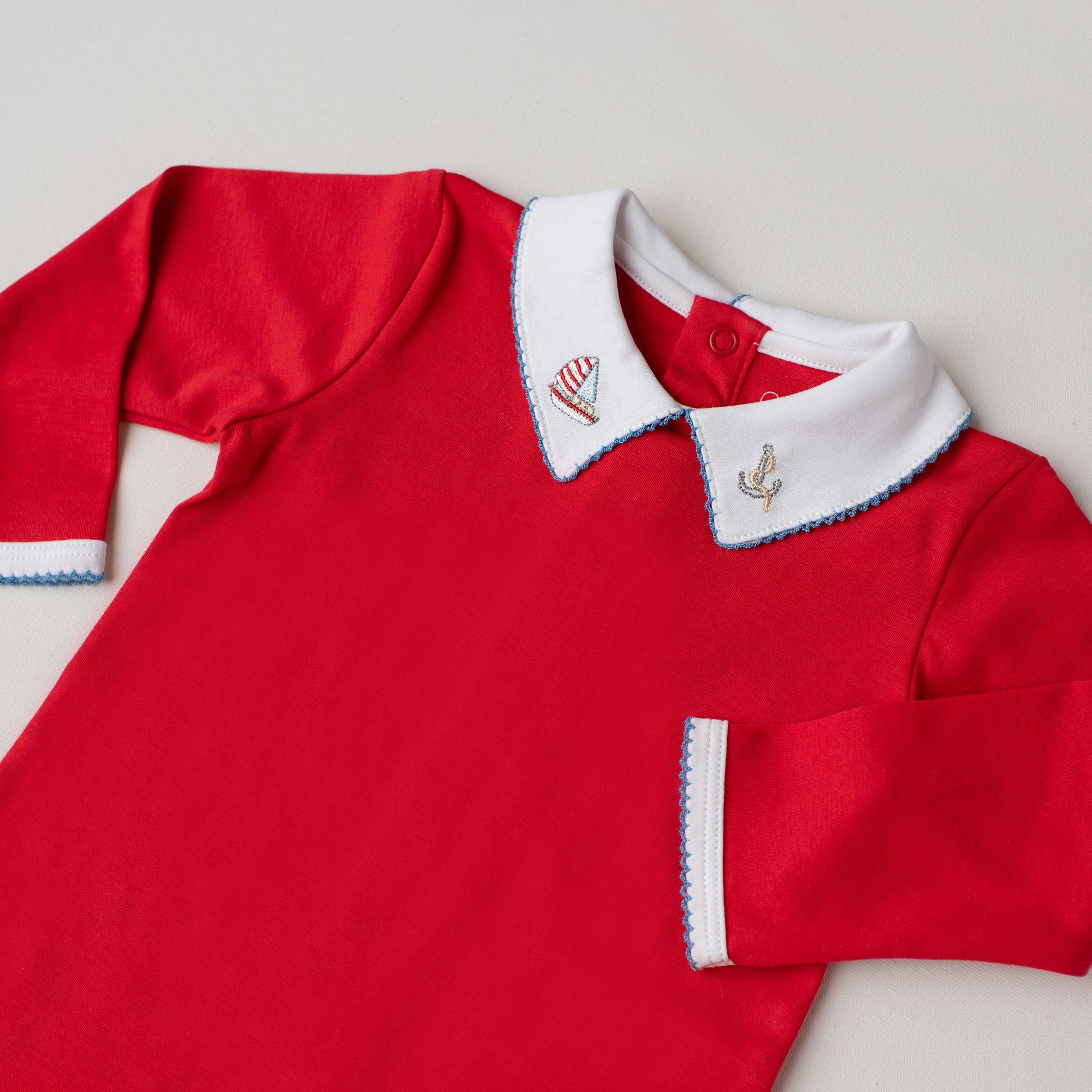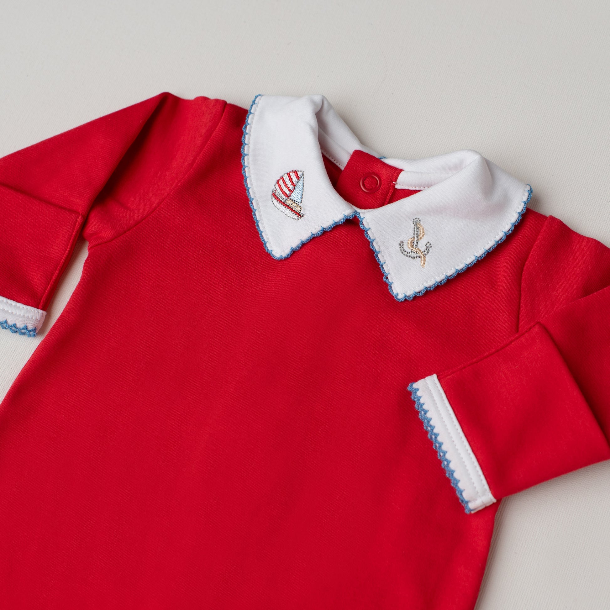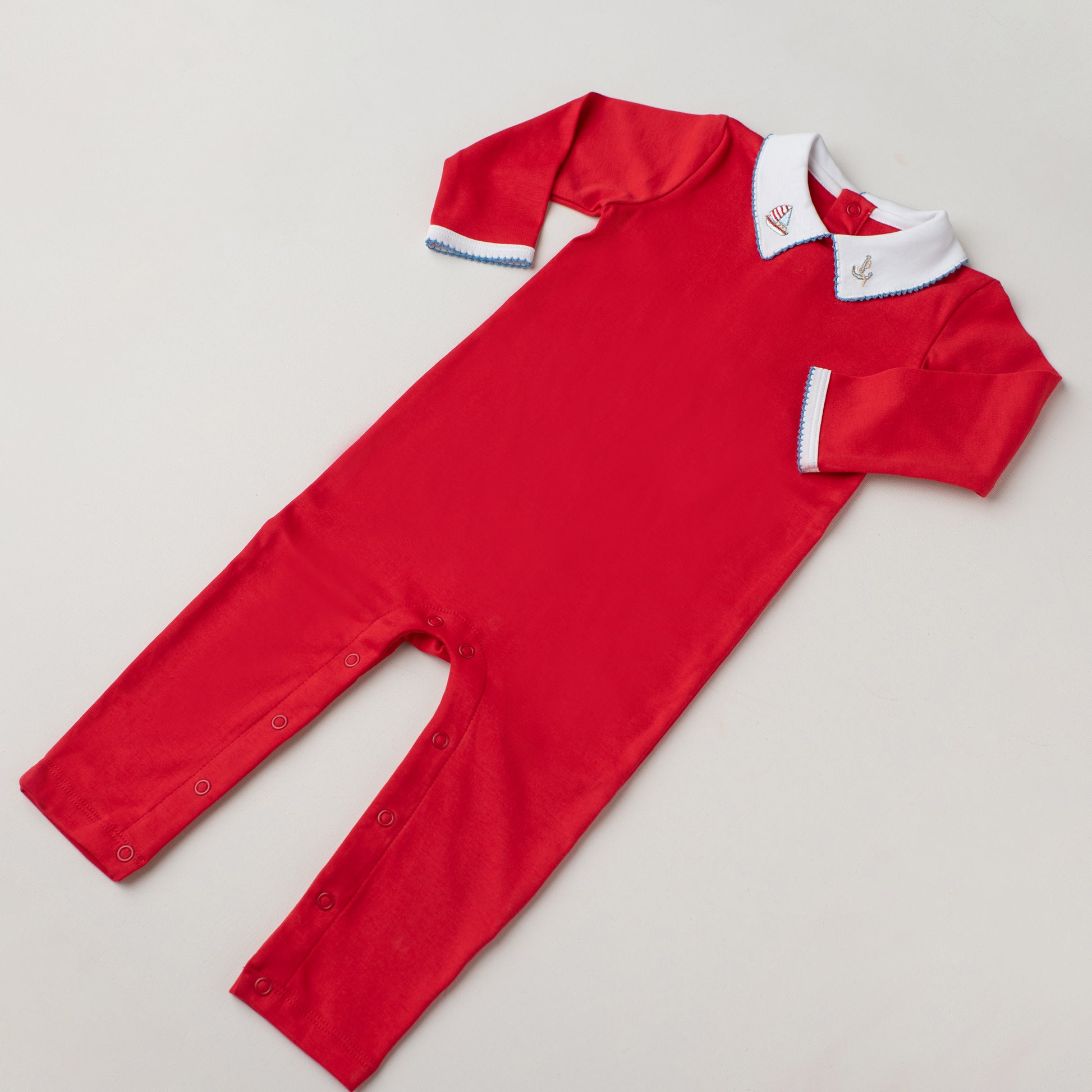 Um macacão tão elegante que vai do pijama ao passeio! Nosso macacão quero-quero é delicioso e arrumadinho: em um alegre tom de vermelho, tem a gola em ponta com bordado náutico de um barquinho à vela e uma âncora.