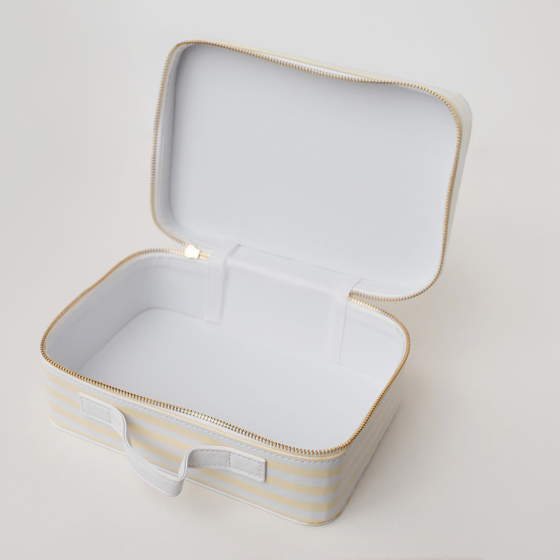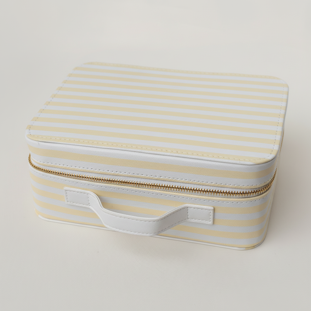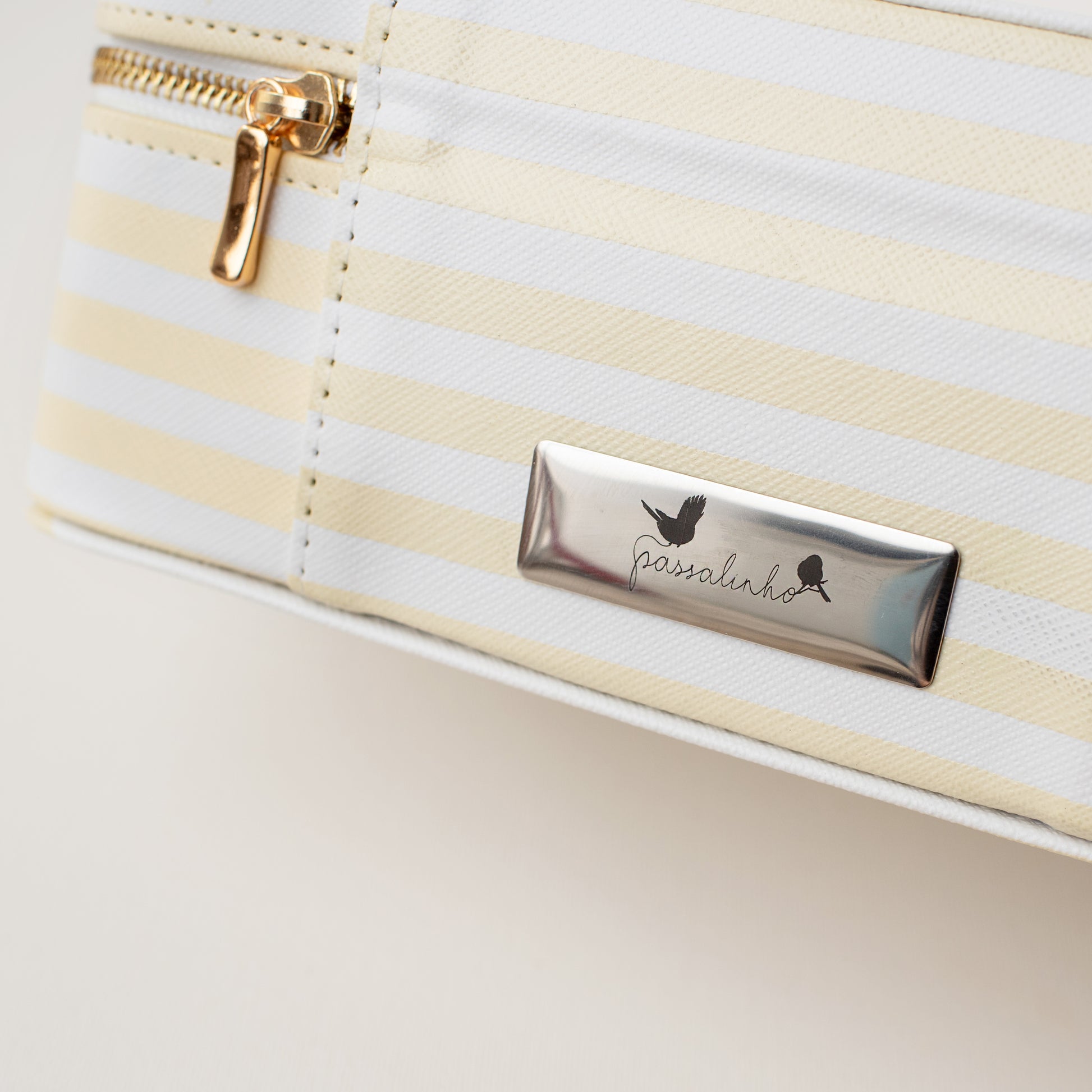 Toda listradinha de branco e amarelo claro, possui fechamento com zíper de alta qualidade e alça na parte superior. Perfeita para guardar fotos, fraldinhas, meias, lacinhos, naninhas... e o que mais couber na imaginação!
