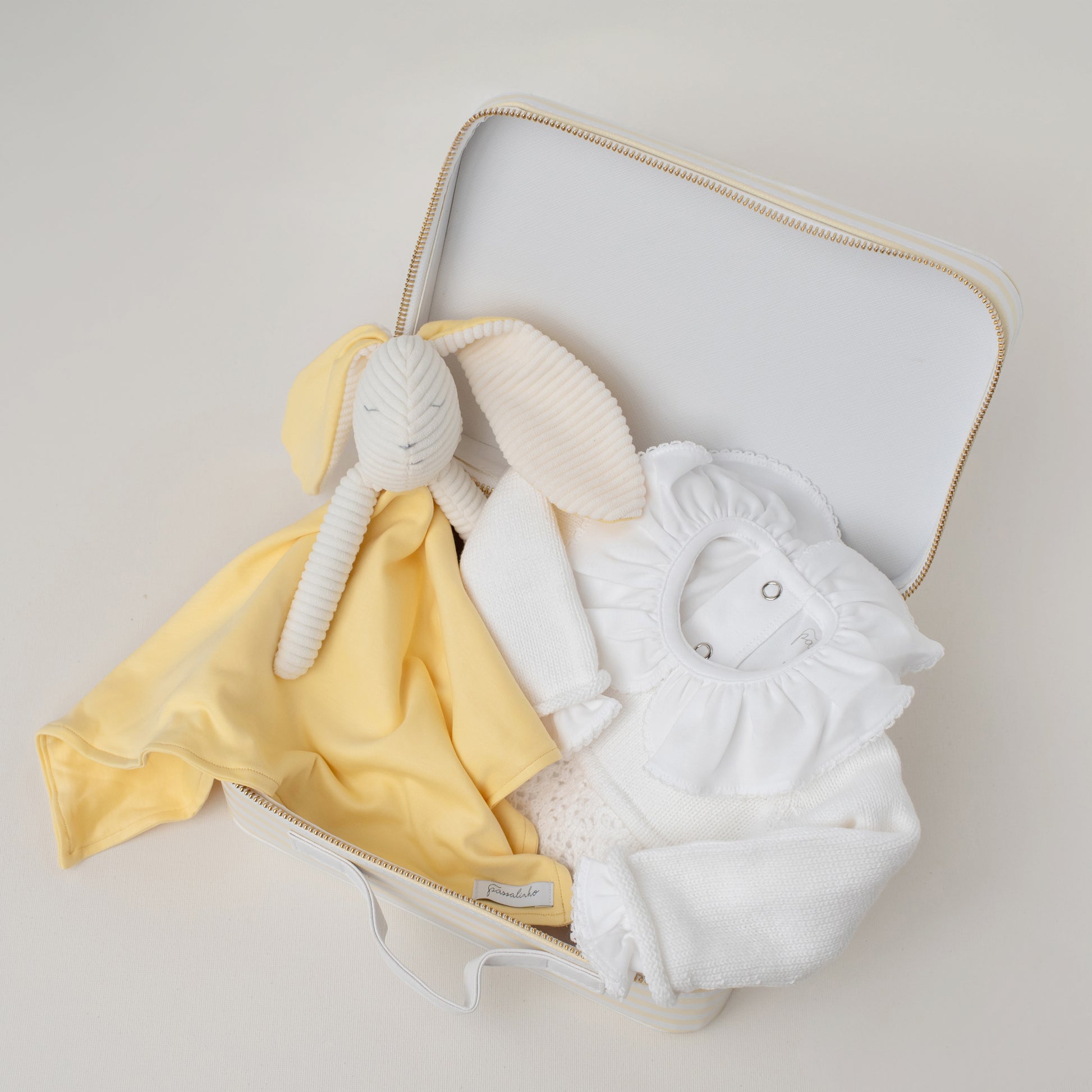 A maletinha mais charmosa, em couro ecológico, perfeita para guardar tesouros e memórias da infância. Recheada com um lookinho nosso, é um presente inesquecível - além de útil e prática, a nossa maletinha ajuda a decorar o quarto do bebê!