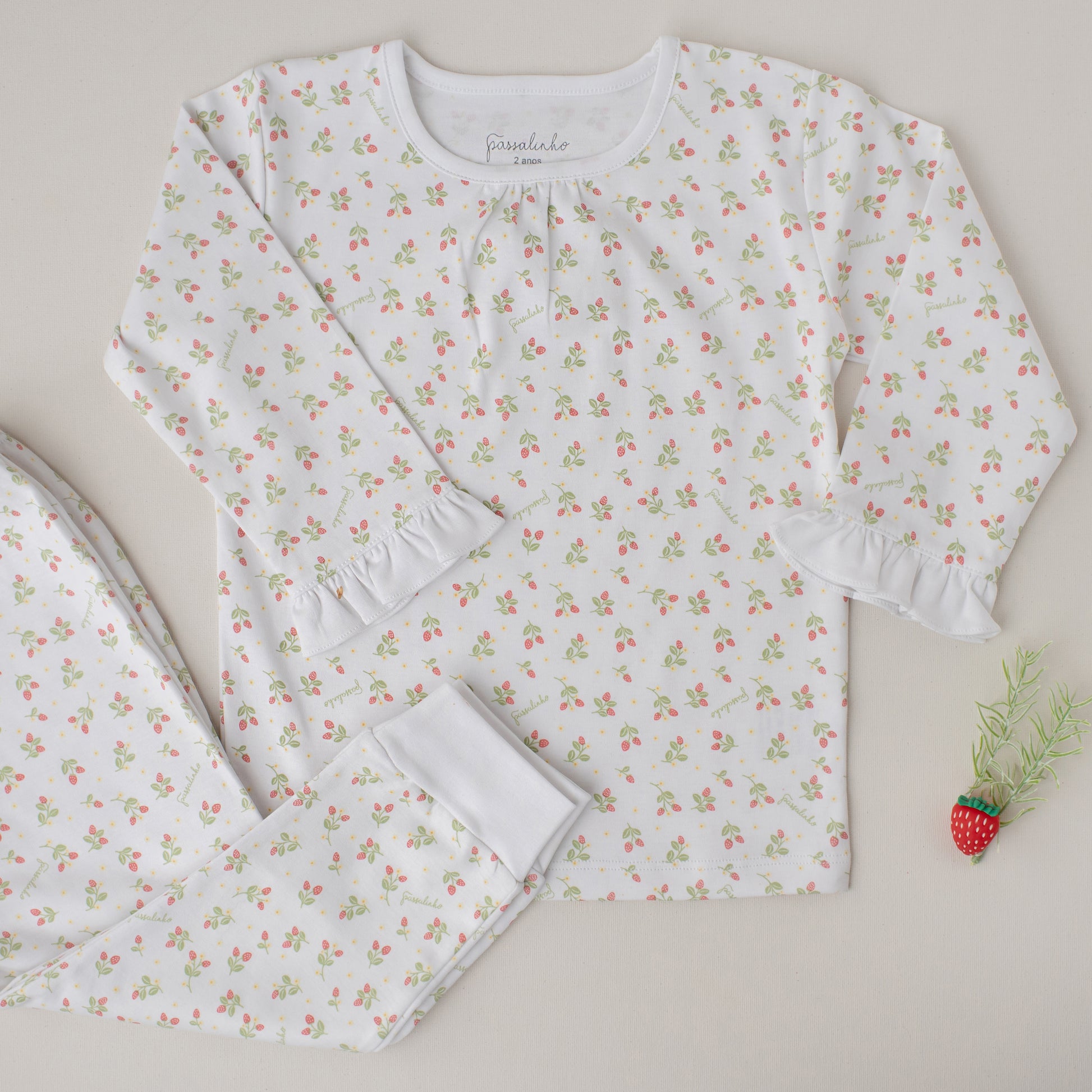Feito em uma linda estampa de moranguinhos e flores exclusivamente desenvolvida para a Passalinho, a blusa franzida no decote tem manga longa com babadinhos no punho e a calça possui punho no tornozelo.