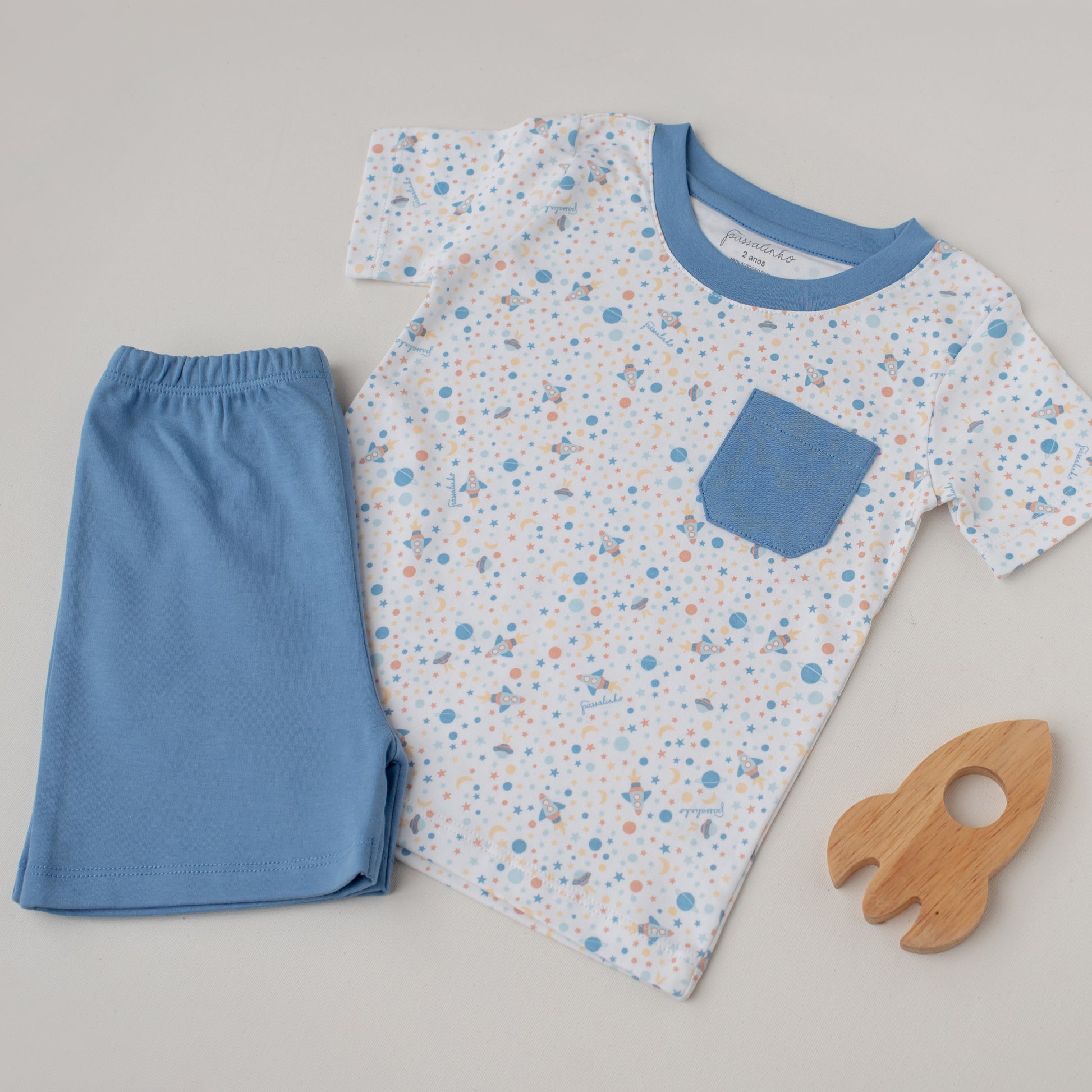 A camiseta estampada de foguetes e planetas tem um bolsinho azul que combina com o shorts. Deixa a criança arrumadinha e super confortável para brincar logo antes de dormir!