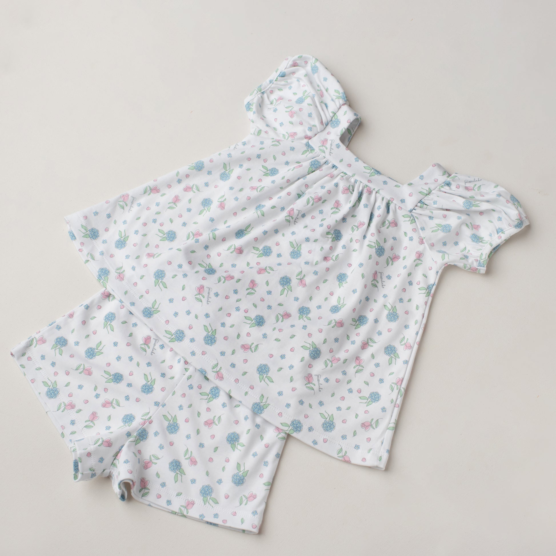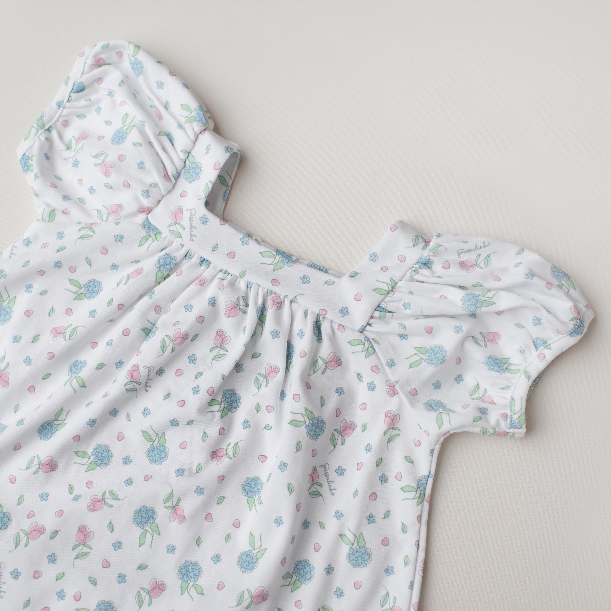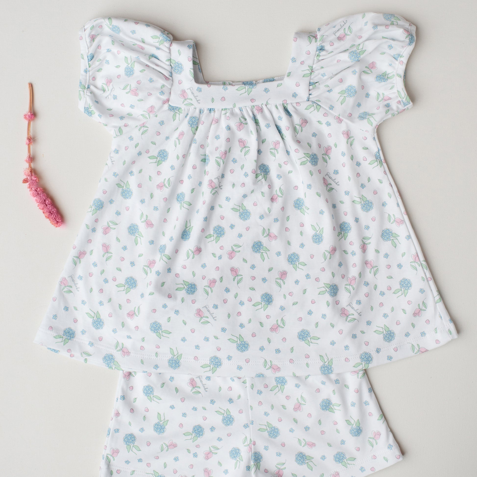 Feito em uma linda estampa exclusivamente desenvolvida para a Passalinho de hortênsias azuis e rosas cor de rosa que parece feita à lápis, a blusa romântica tem decote quadrado com tecido franzido e mangas curtas bufantes.