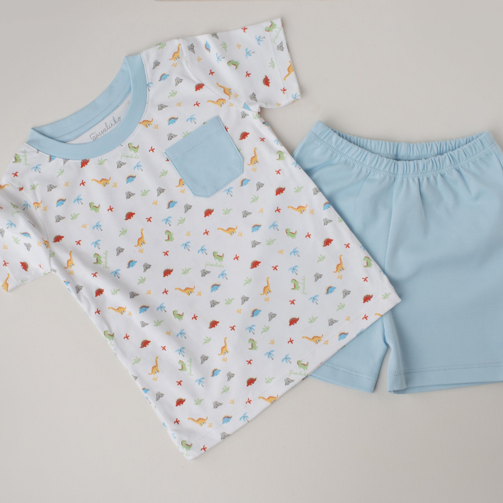 A camiseta tem uma estampa amada pelas crianças com dinossauros coloridos, e possui um bolsinho azul que combina com o shorts. Deixa a criança arrumadinha e super confortável para brincar logo antes de dormir!